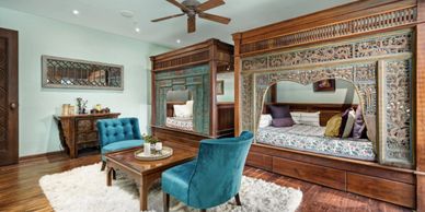 These two intricately handmade wooden beds create a special oasis as well as the essence of India to life. It has direct access to the community courtyard with its own private entrance.
