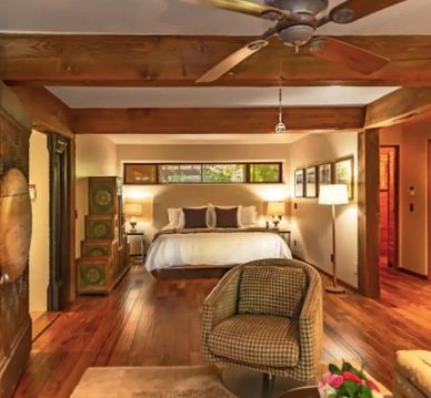 King Bed, Master bath, walk in master closet. Master bathtub. Blackout curtains. Private outdoor swing bed for naps. Very quiet.
